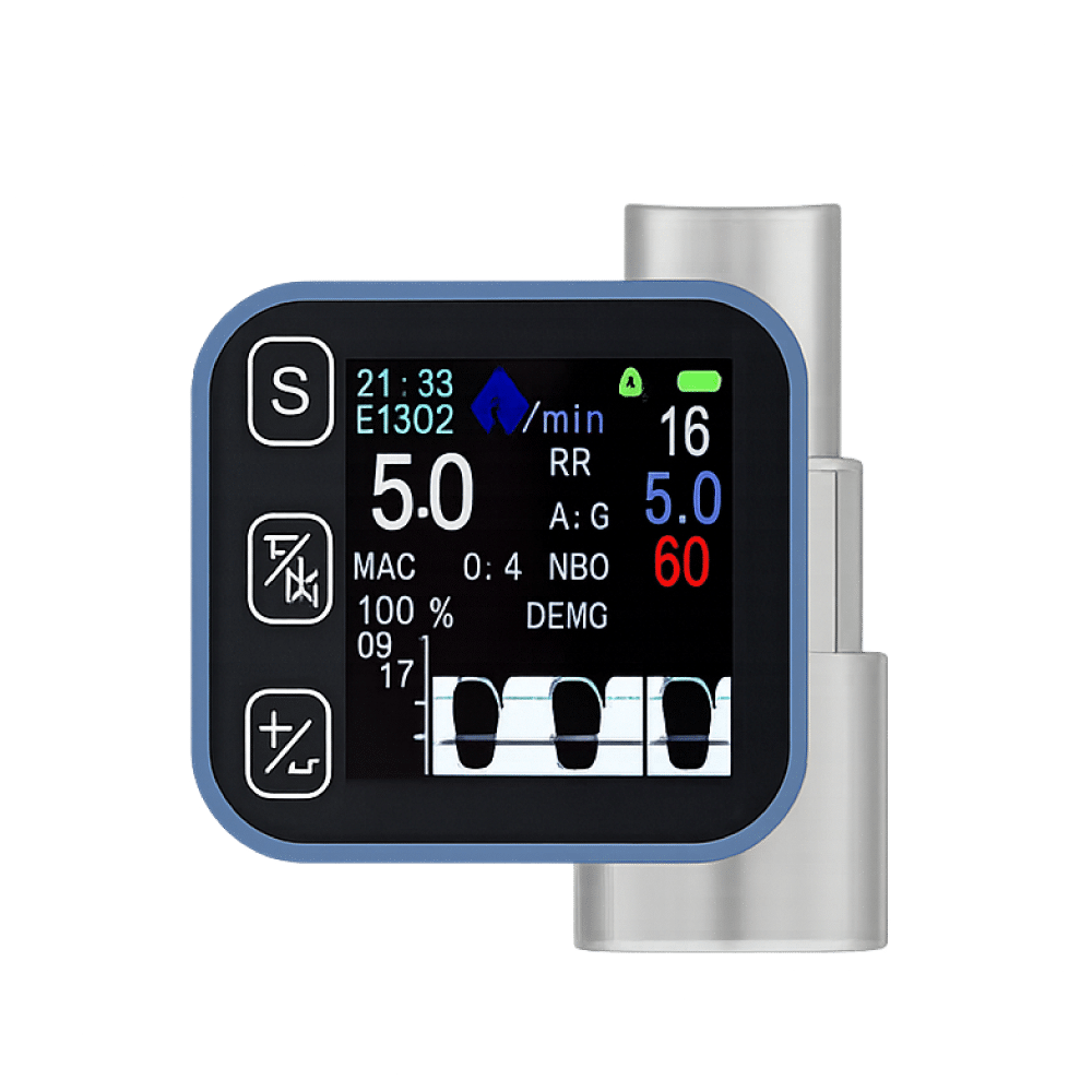- 🖥️ Pantalla 1.5″ TFT, función “caracteres grandes”: visualización nítida de valores numéricos y curva de capnografía hasta 5 metros.